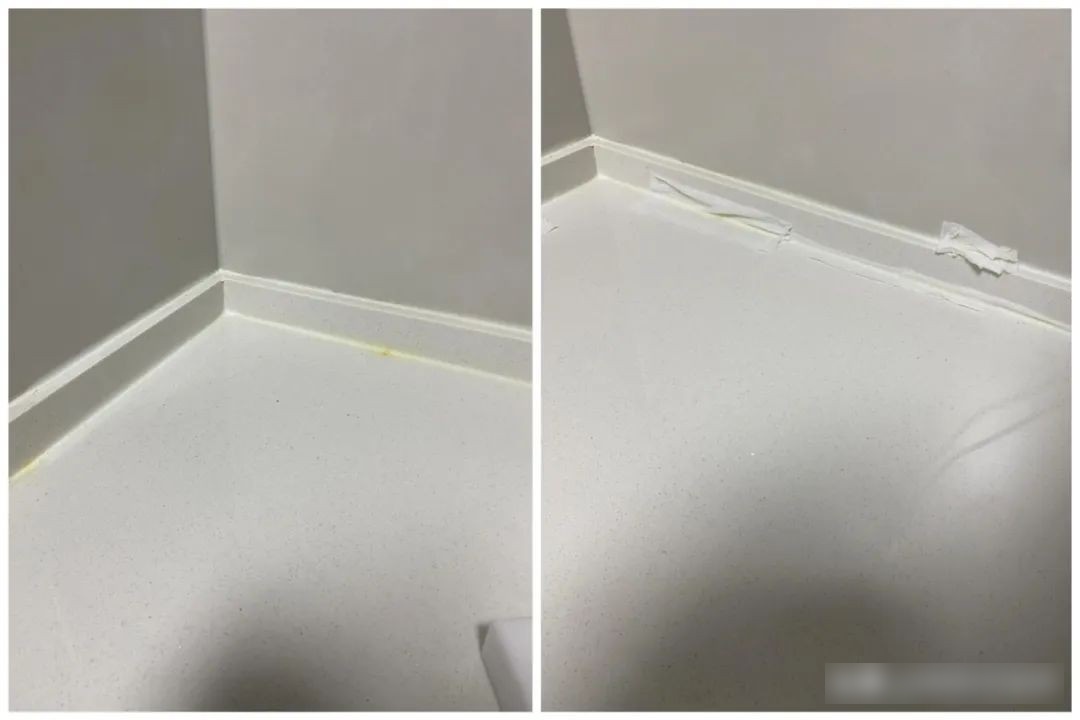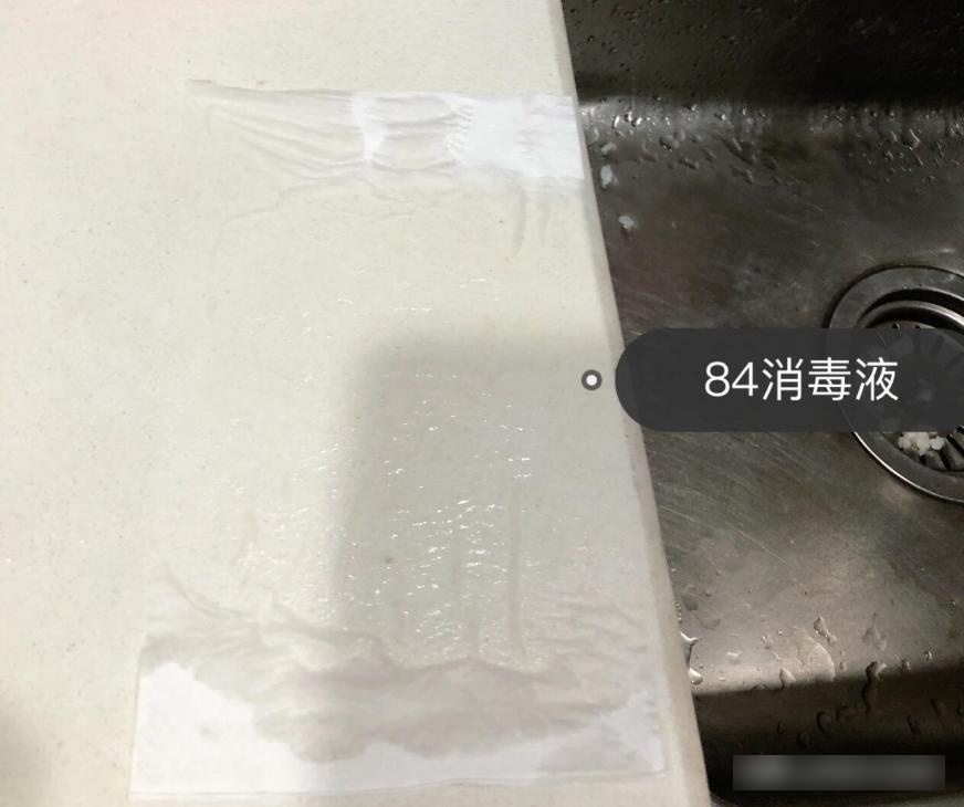 面对石英石台面上的污渍,我们可以倒一点“84消毒液”,然后敷上几张纸巾,静置一个晚上。