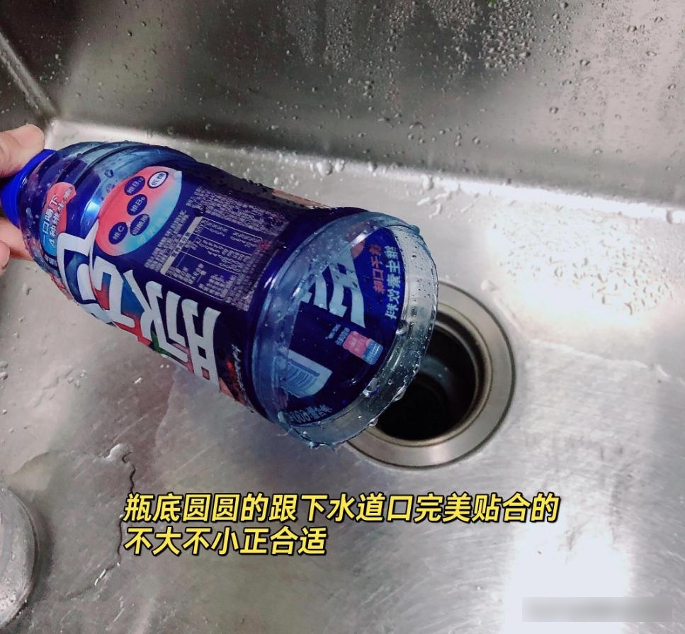 我们可以找一个和下水管道口差不多的饮料瓶,把瓶底剪掉,并且塞在下水口里面。