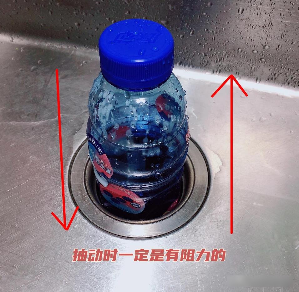 接着把剪开的瓶口塞进下水口,然后对瓶子进行抽动。借助抽动带动的气压,把堵塞物给冲下去。只要堵塞不是很严重,都可以快速解决。