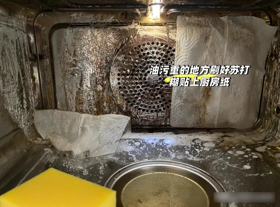一些油污特别顽固的地方,还可以用纸巾蘸取小苏打水,然后贴在上面。等待10分钟左右,再把纸巾拿下来擦洗,这个时候就可以清洁干净了。