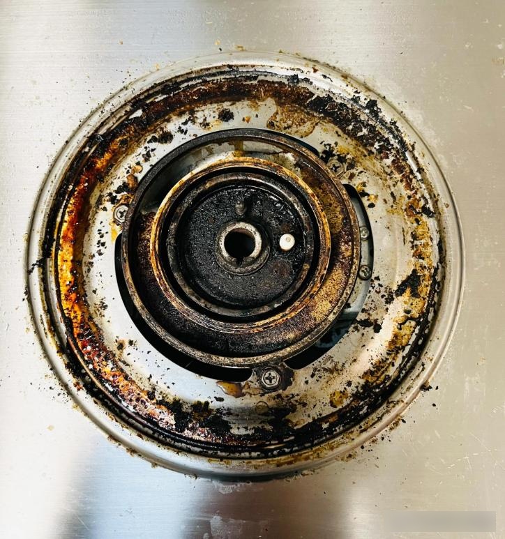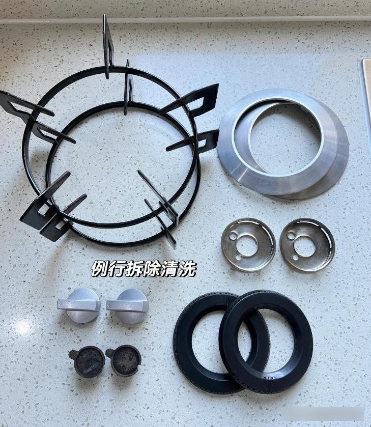 然后把燃气灶上面的设备拿下来,放进水里浸泡。等待20分钟左右,然后用钢丝球或者比较粗糙的抹布来擦洗,很快就可以变得干干净净。