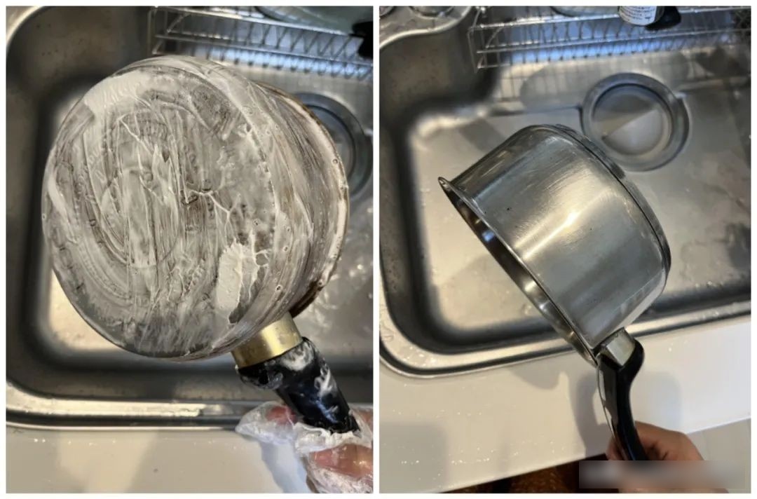 小苏打+洗洁精,五洁粉、清洁膏、番茄酱等,随便挑选一种方法。涂抹在不锈钢锅具上面,然后用海绵砂块进行刷洗。很快,就可以“大力出奇迹”。